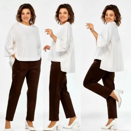 Комплект Состав: вискоза 60%, ПЭ 37 %, лайкра 3%. Верхний срез брюк на притачном поясе на резинке Длина блузы по середине спинки: 70 см. рукава от горловины: 53 см. брюк 104 см.