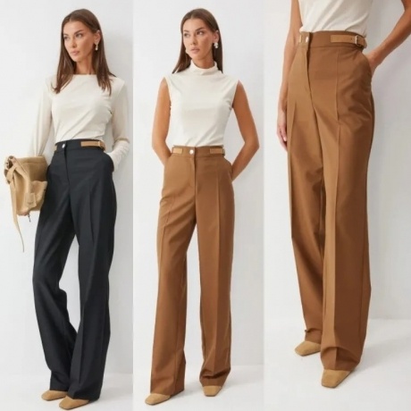 Трикотажные брюки свободного кроя с притачным поясом на резинке с островком. Состав 95% полиэстер, 5% спандекс Длина брюк с поясом: 107см Есть замеры