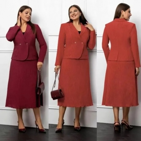 Стильный костюм на подкладке, в классическом стиле из костюмной ткани с блеском, из жакета и юбки. Состав вискоза 46%, полиамид 40%, пэ 4% Дл. жакета 67см юбки 89см