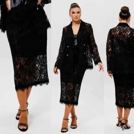 Комплект сочетает полуприлегающий жакет на подкладке и элегантную юбку из эластичной сетки с ажурным бархатным узором. Состав 92% полиэстер, 8% спандекс. подкладка паплин 100%