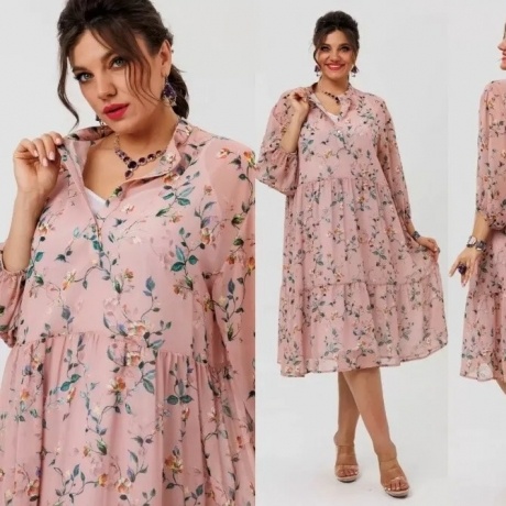 Платье из вискозной ткани, отрезное по линии талии, с полуприлегающим лифом и расклешённой юбкой. По полочке лифа нагрудные вытачки, по спинке средний шов и талиевые вытачки. По горловине отложной воротник рубашечного типа из отделочной ткани. Рукав втачной одношовный длиной ¾, внизу со сборкой и манжетой из декоративной