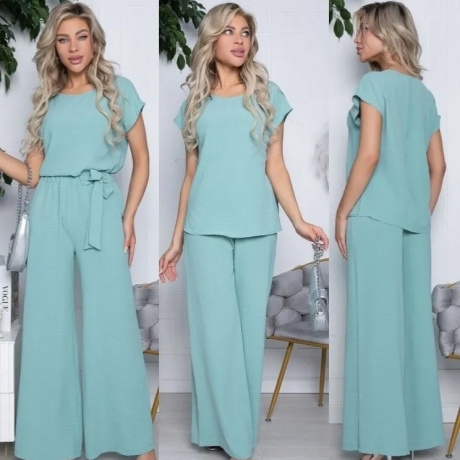 розовый Комплект из летней ткани лен вишер, из брюк палаццо по спинке на резинке и жакета прямого силуэта Состав 96% полиэстер, 4% спандекс Длина жакета по спинке от плеча 70 см брюк 105 см